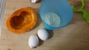 买的南瓜很小,卖菜的大哥说挑南瓜不管大小,要选放在手里感觉沉垫垫的才是好的。鸡蛋两个。盛面粉的杯子有些大,看不出面粉多少,大概就是正常吃米饭的那种碗,一碗。