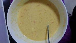 把蒸好的南瓜,鸡蛋,面粉,盐,蜂蜜(也可以用白糖,个人觉得蜂蜜健康,还不长肉,味道也很好),适量白开水放入大碗中。开始搅拌,搅成图中的这样糊糊就可以了。