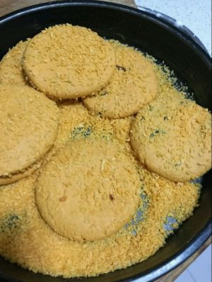 盘里倒入适量的面包糠,把南瓜饼均匀的裹好