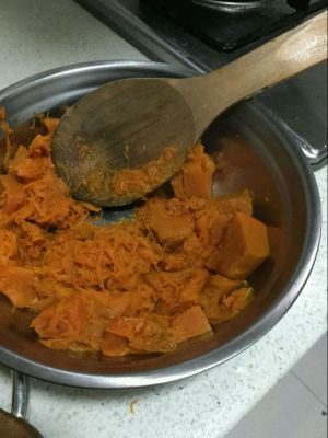用勺子把南瓜压成蓉,也可以直接用料理机打