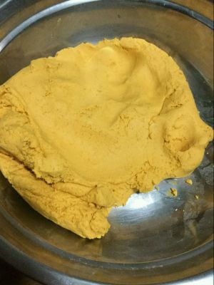 糯米粉和盐(我喜欢咸的南瓜饼所以加的盐,喜欢甜的可以直接加糖就好)加入南瓜蓉中,揉成干硬适中的面团