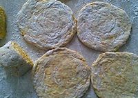 将切好的段摁成饼,在用擀面杖擀成薄饼,如果喜欢吃脆一点的可以把南瓜饼擀的很薄,这样也更容易烙熟。