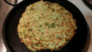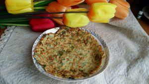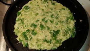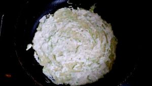 西葫芦洗干净去皮切成大条,用刨丝器把它擦成丝。用一个大盆,打入两个鸡蛋,打散,放入适量面粉,顺着一个方向搅拌,逐步加清水,成浆糊状,放进西葫芦丝,和适量盐,葱花,继续搅拌。面糊越来越稀,因为西葫芦加盐后会出一些水分。调好了备用。