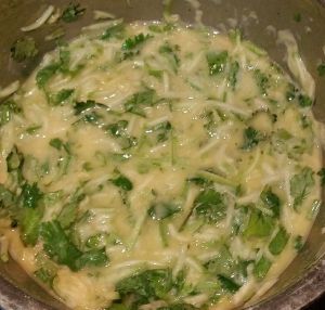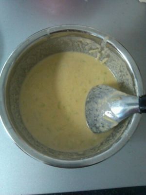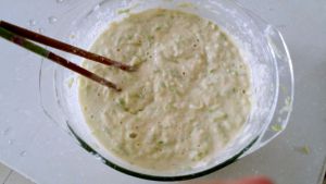 将牛奶、鸡蛋、面粉放入擦好的西葫芦中调成糊状