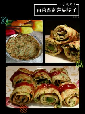 西葫芦擦丝,香菜切碎,放入2个鸡蛋,适量面粉,水搅拌均匀,再放入盐,胡椒粉少许拌匀备用