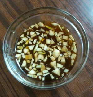 做一个蒜汁。把蒜瓣拍一下,然后切成蒜沫,放小碗里。倒入半碗米醋,几滴香油就可以泡着了。