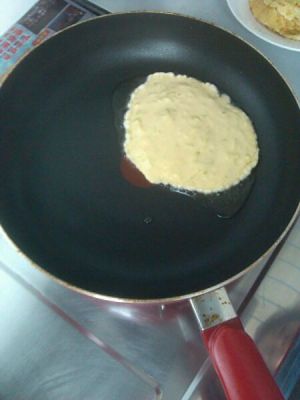 不沾平底锅预热,中小火,可以不放油,一汤勺面糊放进去,煎成小饼