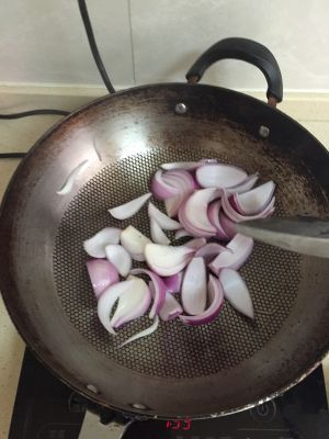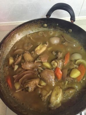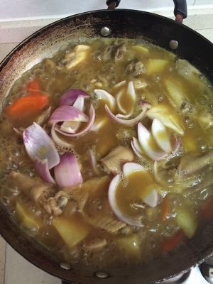 花生油爆炒葱花圆葱,以次放入鸡肉土豆胡萝卜,翻炒后加入鸡肉汤放入咖喱块熬10分钟。