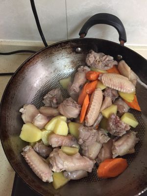 油锅六七成热,依次放入土豆,胡萝卜,鸡肉,加点鸡精,料酒,酱油炒开
