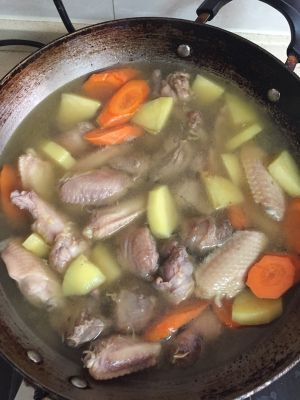 用黄油把洋葱炒香,然后放入胡萝卜,土豆一起鸡肉一起炒熟,炒香!放入约400克水,大火煮开20分钟,小火煮10分钟