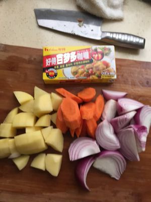 先把鸡肉,土豆,胡萝卜,洋葱洗净切好