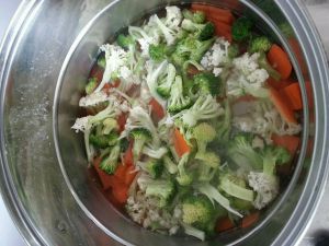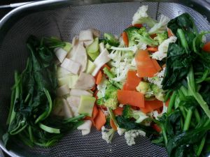 下锅,清水煮开,将蔬菜分别焯水,九成熟即可