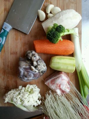 将各类材料:蔬菜类,肉类,海鲜类,调味类清理洗净备好