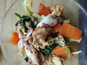 现在开始往锅内加入备好的蔬菜类,炒几下,再加入海鲜类,翻炒,熟了以后出锅