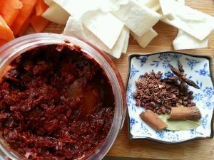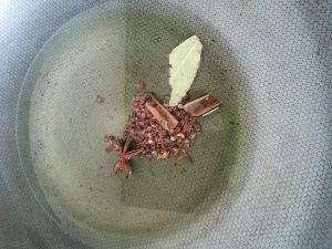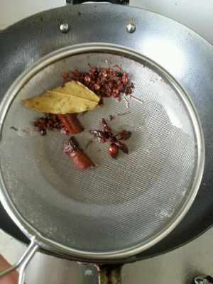 起炒锅,倒入花生油,多一些,放入花椒,八角,桂皮,香叶,煸出香味