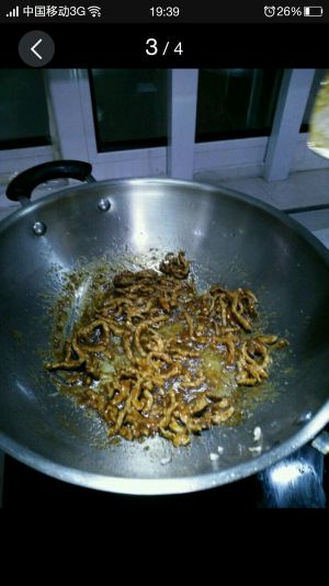 锅里另外放油放两勺甜面酱,一勺姜汁,一勺料酒,一勺办白糖,酱料炒至黏稠壮倒入肉丝,炒成这样捞出