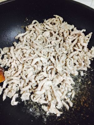 热锅放油,直接煸炒肉丝至变色