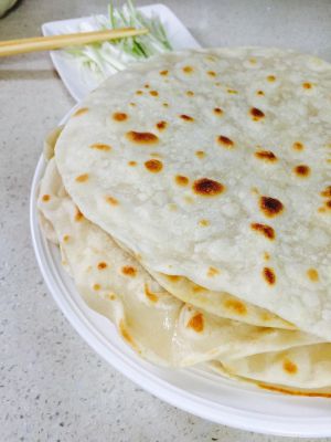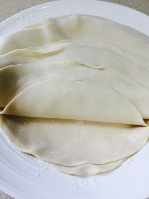 我是先全部擀好薄饼再烙,结果有几张粘在一起,撕开的时候变型了,可以擀好的面皮上涂一层油,或者拍上面粉