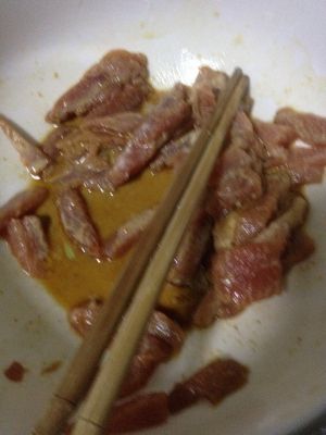 把肉切成长条状,加入盐,料酒,酱油,淀粉,十三香 调匀,腌制十分钟.