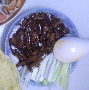 首先肉腌制10分钟,加料:盐、胡椒、料酒、酱油、醋、淀粉、面粉拌匀。上锅倒油热加葱末,倒入刚腌制的肉,炒9分熟,把蒸好的酱倒入拌匀,OK,基本可以出锅了。