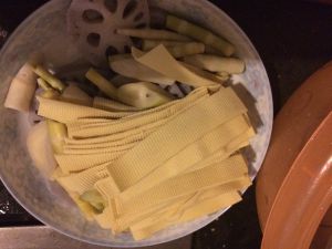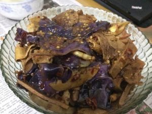 藕切片,干豆皮切条,笋切菱形块,金针菇洗干净。除了干豆皮,都用热水抄一下,过凉水备用。