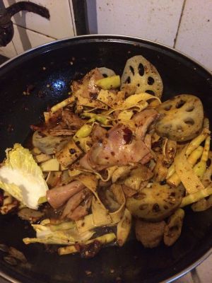 先放培根,再放抄过的菜。翻炒,不用加水,麻辣香锅料里面有很多油。