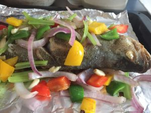 鱼十五分钟拿出来,翻面,把炒的蔬菜放上面,继续烤八分钟