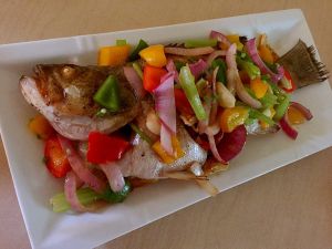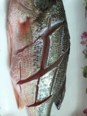 先把所有的材料准备好,把鱼切花刀,给鱼做一个马杀鸡,料酒,盐,孜然粉均匀的抹在鱼的身上,然后腌制半小时,入味。配菜可以是任何你喜欢的配菜,我是选自己爱吃的。