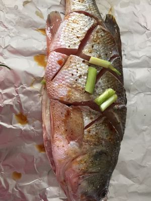 等待烤箱190度预热十分钟后,覆盖好鱼放入烤箱中层200度火烤十五分钟。