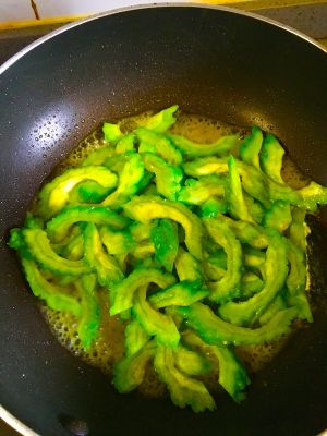 锅内入油爆炒苦瓜,苦瓜变色后加入炒好的鸡蛋,加适量盐翻炒均匀