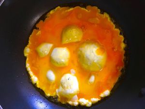 3.锅内热油,倒入蛋液,鸡蛋煎熟后装起备用,所有材料准备完毕!