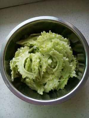 苦瓜切开 挖去瓢籽 洗净切片 用热水焯一下 挤干水分待用。