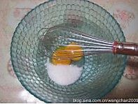 蛋黄加糖打散,加入热糖水(糖和水一起煮沸)搅拌