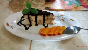 手指饼泡咖啡液后放入奶酪糊中,不要泡太久,手指饼比较吸水,泡时间长了你就拿不出来成一摊面汤了,重复在加一层奶酪糊,再加手指饼,一直加满,然后放冰箱冷藏,至少2个小时,吃之前撒上可可粉,如果有宝宝吃,就别撒可可粉了,粉有点苦,但是刚入口微苦,然后奶酪因为口温融化后那股醇香滑入喉咙,哎呀,太满足,太毕啦!