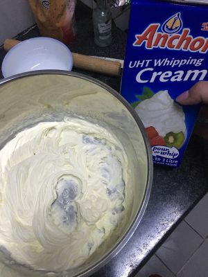 把吉利丁片放到搅拌好的马斯卡彭中,下面就可以打发淡奶油了
