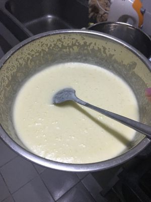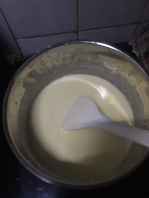 再将剩下的蛋白霜加入蛋黄糊中,搅至完全均匀,牛奶加热至沸腾之前,倒入面糊中,混合好。