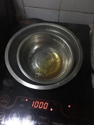 蛋黄打稠后,加入水熬好的糖,水烧开后放入细糖。熬化后放入打稠的蛋黄中,继续打发