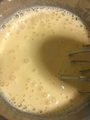 将蛋黄糊鱼蛋白糊一次性切拌混合好,混合好的面糊应没有消泡声。