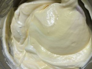 打蛋清,蓬松起沫后加2大勺糖,打出奶油装后,再兑入125克的mascarpone.打均匀。再用一样的方法打蛋黄酱。