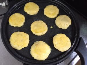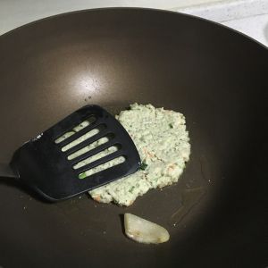 油稍微放多一些,这样不容易粘锅,两边稍微发黄,中间糊状干了的时候,翻过来