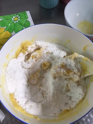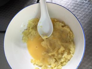 分多次加入鸡蛋液到土豆泥中,搅拌均匀