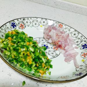 将洗净切丁的青椒和洋葱下油锅翻炒至半熟