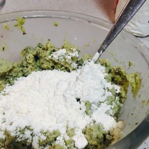 再加入面粉,拌成均匀的糊状,加些香葱拌匀。