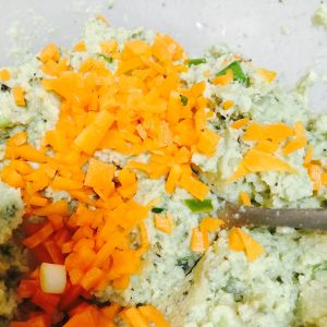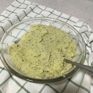 在土豆泥中加入豆渣(我用的一点黑豆,所以有点黑黑的)