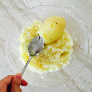 土豆洗净,放锅里煮至熟透(用筷子插进去,很容易插到底就是熟透了),迅速放到冷水里,待冷却后批就很好剥下来了(热胀冷缩的原理)。用勺子碾成土豆泥,也可以用保鲜袋装起来,用擀面杖碾成泥