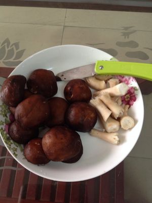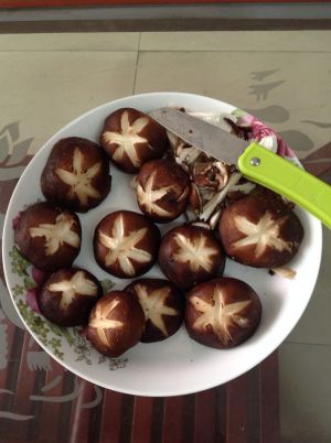 香菇表面用小刀刻出花纹,刻出来的碎留着,和菇柄一起炒,不要浪费