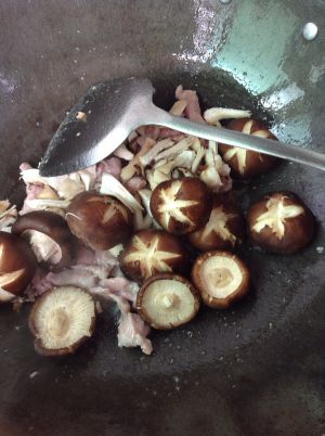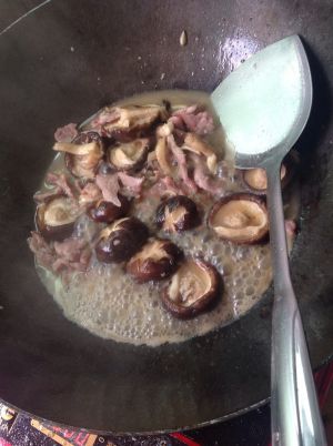 翻炒片刻,倒入半碗水(或者泡香菇的干净水,我用的泡香菇水)。倒入蚝油,生抽。大火烧开。