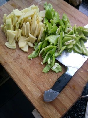 土豆削皮,尖椒去仔儿,都切成片,葱切成葱花,我是洗了一颗,但不用这么多。
