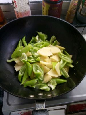 下尖椒炒一下,再放土豆片,土豆不吃油,火不要大,不停翻炒。