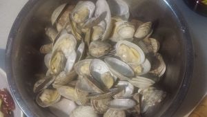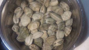 浸泡在盐水中半小时后,将花蛤用小刷子清洗干净。